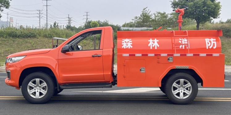 單排森林消防灑水車:窄車身設計(寬度<2.1m)可深入叢林窄道,前置噴水系統精準壓制地表火源,后置灑水炮覆蓋樹冠火。