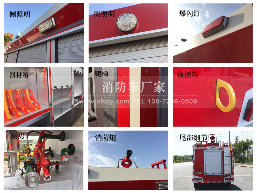 駕駛室頂部前端為長排警燈,車身后配有24V/60W火場照明燈一只,車輛兩側上方各配有紅藍相配的爆閃燈,下方安裝安全標志燈,乘員室、器材箱、 泵房內均裝有照明燈,加裝有100W警報器,回轉警燈開關、通訊設備預備接口。
